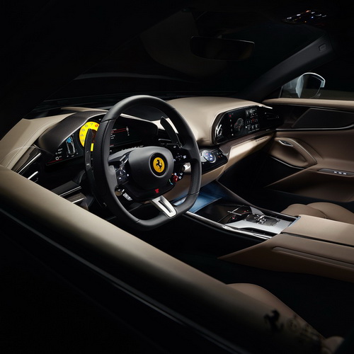 เมื่อเปิดประตู จะเผยให้เห็นพื้นที่กว้างขวางจนน่าทึ่ง และที่น่าแปลกใจพอๆ กันก็คือ การตกแต่งภายในที่หรูหราล้ำสมัย จนรู้สึกได้ถึงความสง่างามและล้ำยุค ภาษาการออกแบบยุคใหม่ผสานเข้ากับสุนทรียะของรถสปอร์ต GT อันเป็นเอกลักษณ์ของเฟอร์รารี่ได้อย่างกลมกลืน รูปทรงทั้งหมดมีขนาดกะทัดรัดแต่มีเจตนาเพื่อเพิ่มทั้งพื้นที่ใช้สอยและสรีรศาสตร์