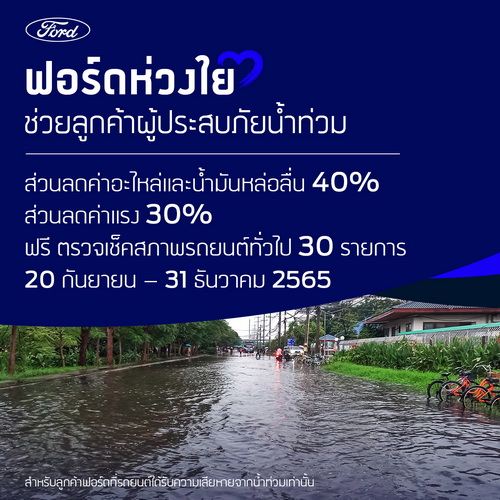 ฟอร์ด ประเทศไทย ออกแคมเปญบรรเทาความเดือดร้อนของลูกค้าฟอร์ดที่ได้รับผลกระทบจากภัยน้ำท่วม มอบส่วนลดค่าอะไหล่ น้ำมันหล่อลื่น 40% และค่าแรง 30% พร้อมตรวจสภาพรถยนต์ทั่วไปฟรี 30 รายการ ตั้งแต่วันนี้จนถึงวันที่ 31 ธันวาคม 2565 ที่ศูนย์บริการฟอร์ด ทั่วประเทศ