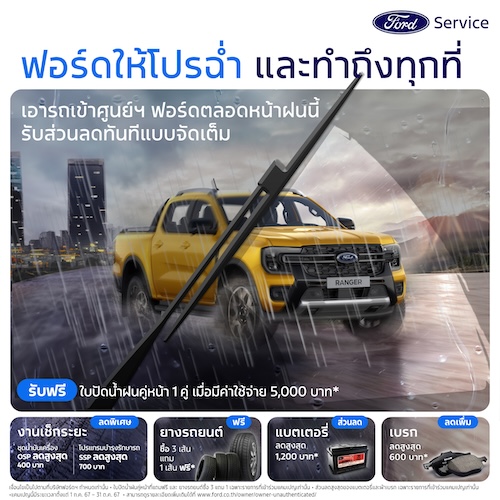 ฟรี ใบปัดน้ำฝนคู่หน้า 1 คู่ เมื่อลูกค้าทำการเช็กระยะและมีค่าใช้จ่ายตั้งแต่ 5,000 บาท ขึ้นไป สำหรับลูกค้ารถยนต์ฟอร์ดทุกรุ่น ไม่จำกัดระยะทาง ทั้งนี้ ค่าใช้จ่ายที่ร่วมรายการ ได้แก่ ค่าอะไหล่และของเหลว ค่าโปรแกรม OSP หรือ SSP หรือ Ford Care รวมถึงค่าอุปกรณ์ตกแต่งแท้ฟอร์ด