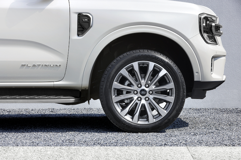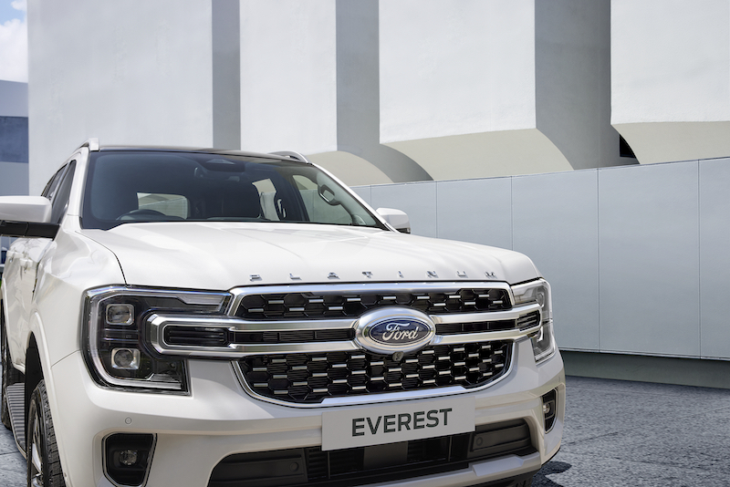 ตั้งแต่กระจังหน้าขนาดใหญ่ดีไซน์ใหม่ที่เป็นเอกลักษณ์เฉพาะสำหรับฟอร์ด เอเวอเรสต์ แพลทตินัม พร้อมตัวอักษร PLATINUM สีโครเมียม 3 ตำแหน่งบนฝากระโปรงหน้า บานประตูคู่หน้า และฝาท้าย หลังคาสีดำ (Black Roof) ตราสัญลักษณ์ วี 6 โดดเด่นบนช่องระบายอากาศด้านข้างตัวถัง และล้ออัลลอยขนาด 21 นิ้ว พร้อมยางขนาด 275/45 R21 สะท้อนถึงความสปอร์ตและหรูหรา