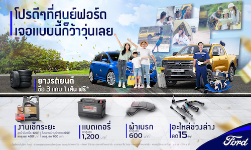 ฟอร์ด ประเทศไทย มอบแคมเปญข้อเสนอสุดคุ้มด้านบริการให้ลูกค้าอุ่นใจตลอดเส้นทางตลอดช่วงเทศกาลพิเศษ ได้แก่ ส่วนลดค่าอะไหล่ช่วงล่างและโช้คอัพถึง 15% ส่วนลดพิเศษชุดน้ำมันเครื่องสุดคุ้มสูงสุด 400 บาทหรือส่วนลดโปรแกรมบำรุงรักษาตามระยะสูงสุด 700 บาท ซื้อยางรถยนต์ 3 เส้น แถมฟรี 1 เส้น