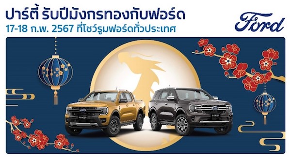 ฟอร์ด ประเทศไทย ร่วมกับผู้จำหน่ายฟอร์ด ต่อยอดโปรแรงจัด ‘ปาร์ตี้รับปีมังกรทองกับฟอร์ด’ ระหว่างวันที่ 17-18 กุมภาพันธ์ 2567 ที่โชว์รูมฟอร์ดทั่วประเทศ ชวนลูกค้าเลือกซื้อรถฟอร์ดกับข้อเสนอที่พลาดไม่ได้ #นาทีทองต้องจองฟอร์ด ซื้อรถฟอร์ดแจกทันทีทองคำแท่ง 1 บาท ทุกคัน เสริมมงคลตลอดทั้งปี