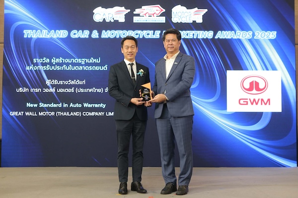 GWM (Thailand) ตอกย้ำความเชื่อมั่นในงานด้านบริการหลังการขายผ่านการรับประกันคุณภาพเครื่องยนต์ดีเซลและการดูแลลูกค้าแบบระยะยาว ด้วยการคว้ารางวัล “ผู้สร้างมาตรฐานใหม่แห่งการรับประกันในตลาดรถยนต์” จากสมาคมผู้สื่อข่าวรถยนต์และรถจักรยานยนต์ไทย (สรยท.)