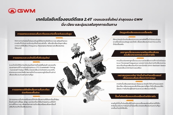 ทั้งหมดนี้คือ 7 ไฮไลต์ จาก GWM ที่เฝ้าพัฒนาเครื่องยนต์ดีเซลมาอย่างยาวนานกว่า 30 ปี สู่ผลสำเร็จของเครื่องยนต์ดีเซลใหม่ล่าสุด 2.4T ใน GWM TANK 300 DIESEL เพื่อให้ทุกการเดินทางในทุก ๆ เส้นทางได้รับความสะดวกสบายมากกว่า และประสบการณ์ที่เหนือกว่าในทุก ๆ ด้านอย่างแท้จริง