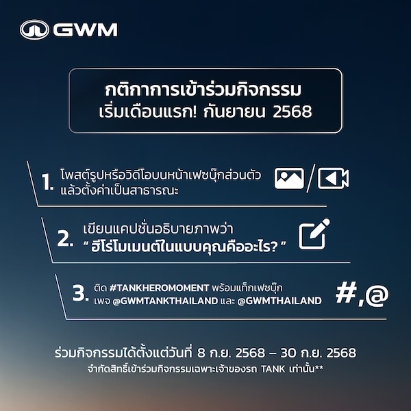- ประกาศผลประจำเดือนกันยายนในวันที่ 6 ตุลาคม 2568 เวลา 18.00น. ทาง Facebook Page: GWM TANK THAILAND