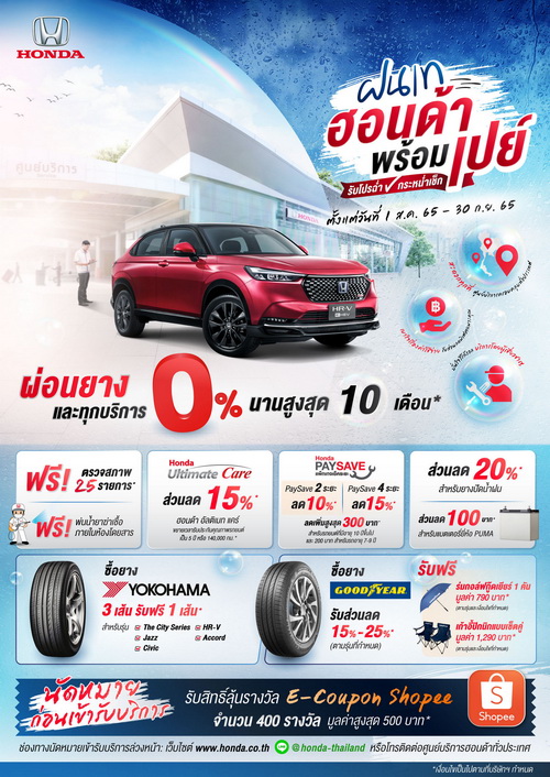 สำหรับแคมเปญ “ฝนเท ฮอนด้าพร้อมเปย์ รับโปรฉ่ำ กระหน่ำเช็ก” เริ่มตั้งแต่วันที่ 1 สิงหาคม 2565 – 30 กันยายน 2565 ลูกค้าสามารถสอบถามรายละเอียดเพิ่มเติมได้ที่โชว์รูมและศูนย์บริการฮอนด้าทั่วประเทศ หรือศูนย์บริการข้อมูลฮอนด้า 24 ชั่วโมง (Honda Call Center) โทร. 0 2341 7777 หรืออ่านรายละเอียดเพิ่มเติมที่ www.honda.co.th/service