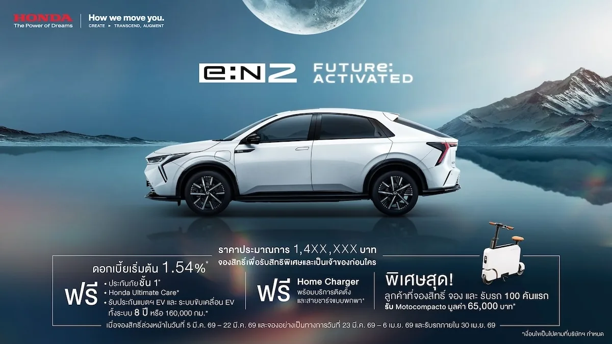 ผู้ที่กำลังมองหารถยนต์ไฟฟ้า SUV ในประเทศไทยมีตัวเลือกใหม่เพิ่มขึ้น เมื่อ Honda e:N2 รถยนต์ไฟฟ้า 100% รุ่นใหม่ของฮอนด้าเปิดเผยรายละเอียดสเปกและราคาโดยประมาณในไทย ก่อนเปิดตัวอย่างเป็นทางการในงาน Bangkok International Motor Show 2026 รุ่นนี้ถูกวางตำแหน่งเป็น EV SUV ในไลน์อัป xEV ของ Honda พร้อมระยะทางวิ่งสูงสุด 530 กิโลเมตรต่อการชาร์จหนึ่งครั้ง (มาตรฐาน NEDC) และเปิดให้ลูกค้าจองสิทธิ์ล่วงหน้าระหว่างวันที่ 5–22 มีนาคม 2569 ก่อนประกาศราคาจำหน่ายจริงในวันที่ 23 มีนาคม 2569