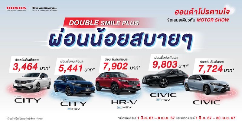 โดยแต่ละรุ่นมาพร้อมข้อเสนอพิเศษ*** กับ ‘ฮอนด้าโปรตามใจ’ ไม่ว่าจะเป็น ดอกเบี้ยพิเศษเริ่มต้น 0% พร้อม ฮอนด้า เอ็กซ์คลูซีฟ แคร์ (Honda Exclusive Care) หรือทางเลือก ดับเบิ้ล สไมล์ พลัส** ดาวน์เริ่มต้นน้อย ผ่อนต่อเดือนต่ำ