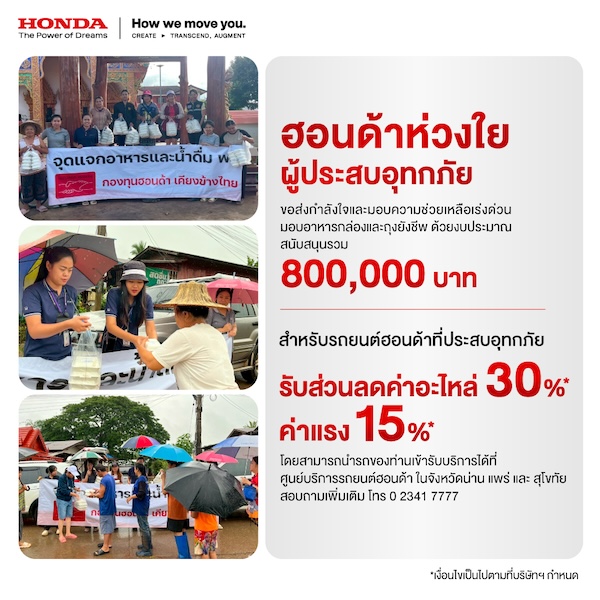 นอกจากนี้ ฮอนด้า ยังขอมอบสิทธิ์สำหรับลูกค้ารถยนต์ฮอนด้าทุกรุ่นที่ได้รับความเสียหายจากภัยธรรมชาติ โดยมอบส่วนลดค่าอะไหล่ 30%* และส่วนลดค่าแรง 15%* โดยสามารถนำรถเข้ารับบริการได้ที่ศูนย์บริการรถยนต์ฮอนด้าในพื้นที่ ฯ ได้แก่