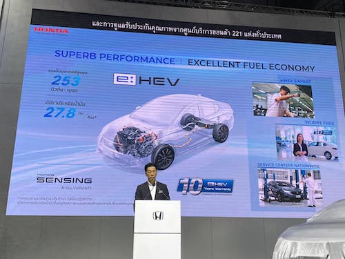 ทำให้ ฮอนด้า ซิตี้ เป็นแบรนด์ยอดนิยมที่อยู่ในใจลูกค้าเสมอมา ในวันนี้ผมเชื่อมั่นว่าฮอนด้า ซิตี้ ใหม่ ได้ปรับโฉมใหม่ ด้วยดีไซน์ภายนอกที่เสริมความสปอร์ตพรีเมียมยิ่งขึ้น และภายในที่กว้างขวาง สะดวกสบายในทุกที่นั่ง โดยรุ่น e:HEV จะมอบประสบการณ์การขับขี่ที่ยอดเยี่ยมในชีวิตประจำวันให้กับลูกค้าได้อย่างไร้กังวล และยังให้อัตราการประหยัดน้ำมันที่ดีเยี่ยม