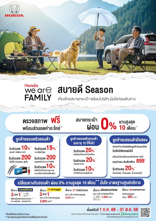 พบกับข้อเสนอดีๆ จากฮอนด้า ทั้ง ‘Honda Pro OH! MY GOOOOD ยกขบวนคุ้ม รับเลยไม่ต้องลุ้น’ ในการออกรถใหม่ และสิทธิพิเศษจากแคมเปญ ‘สบายดี Season บริการหลังการขาย ผ่อนสบาย 0%’ ที่พร้อมดูแลและให้บริการลูกค้าครอบครัวฮอนด้าในการตรวจเช็กสภาพรถและบริการอื่นๆ ที่ศูนย์บริการทั่วประเทศ ตั้งแต่วันที่ 1 กรกฎาคม – 31 สิงหาคม 2568