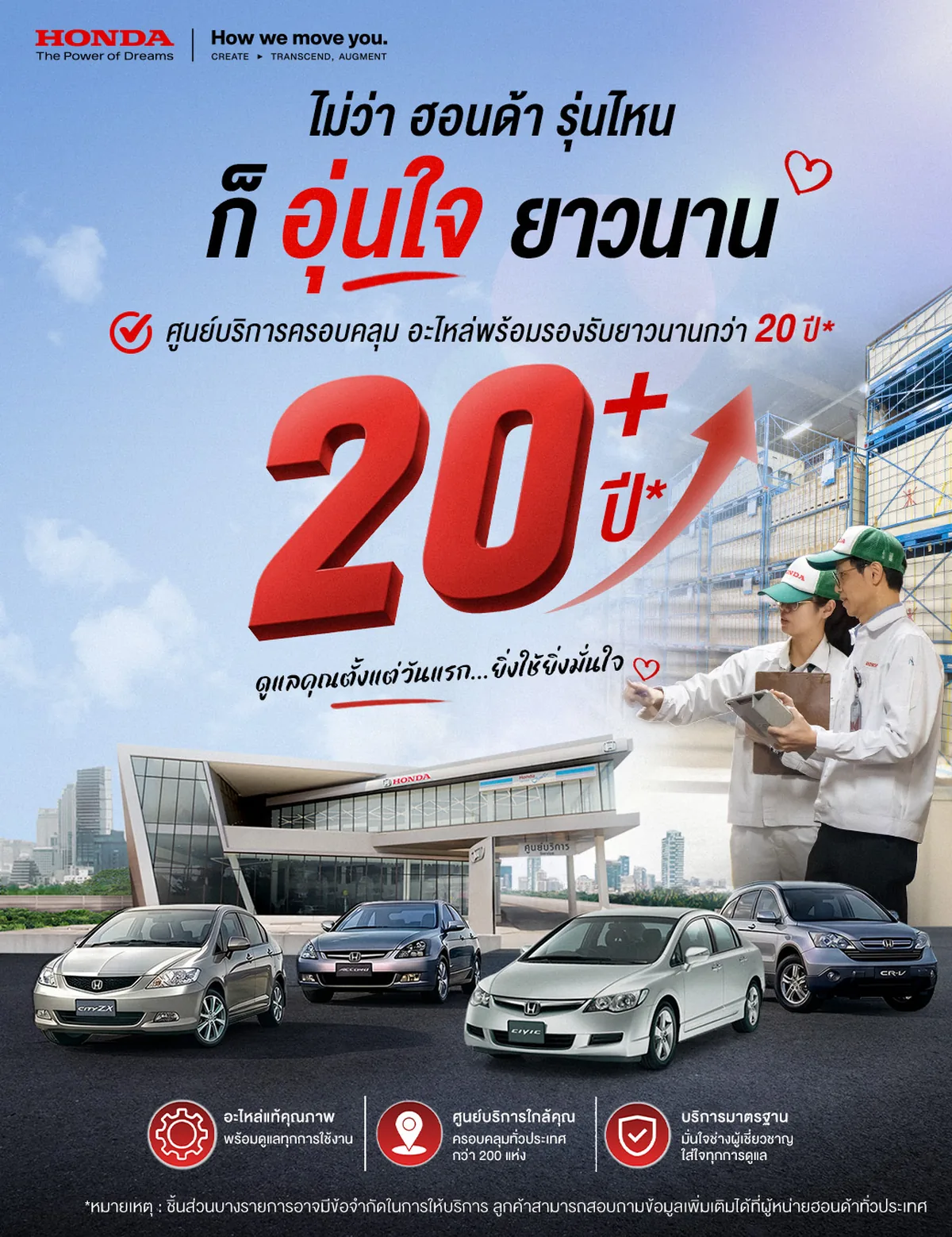 ฮอนด้าระบุว่า การดูแลลูกค้าอย่างต่อเนื่องเป็นหัวใจสำคัญของการสร้างความไว้วางใจ เพื่อให้ผู้ใช้รถยนต์ฮอนด้าสามารถใช้งานรถได้อย่างไร้กังวล และมั่นใจตลอดการเดินทางทุกเส้นทาง