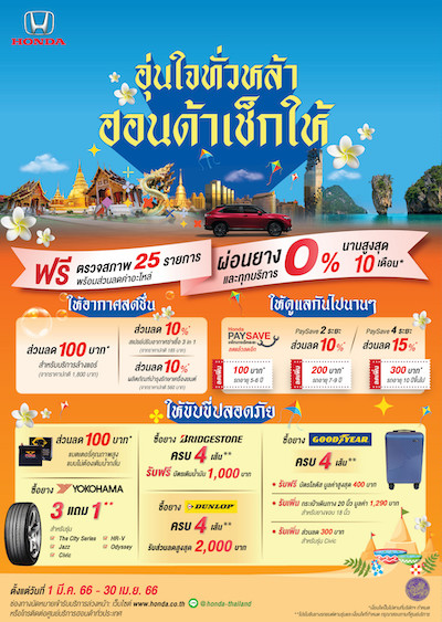 - และ “ให้ขับขี่ปลอดภัย” รับส่วนลดสำหรับแบตเตอรี่รถยนต์คุณภาพสูงแบบพร้อมใช้งานไม่ต้องดูแลน้ำกลั่น รวมถึงโปรโมชันสำหรับยางรถยนต์แตกต่างกันในแต่ละรุ่น อาทิ ซื้อ 3 ฟรี 1 รับฟรีบัตรน้ำมัน บัตรกำนัลโลตัส หรือกระเป๋าเดินทางจากฮอนด้า โดยลูกค้าสามารถเลือกผ่อนชำระค่าใช้จ่ายงานบริการดอกเบี้ย 0% นานสูงสุด 6 เดือนและยางรถยนต์นานสูงสุด 10 เดือน เมื่อนำรถยนต์เข้ารับบริการที่ศูนย์บริการฮอนด้าที่ได้มาตรฐานทั่วประเทศ 224 แห่ง ตั้งแต่วันที่ 1 มีนาคม 2566 – 30 เมษายน 2566