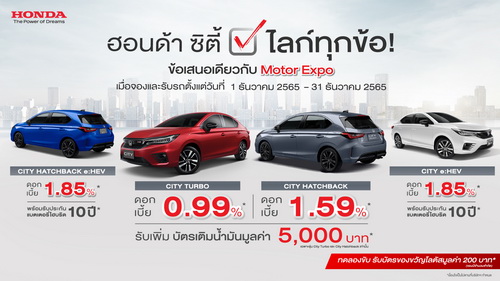 • ฮอนด้า ซิตี้ แฮทช์แบ็ก อี:เอชอีวี รับดอกเบี้ยพิเศษ 1.85% และรับประกันแบตเตอรี่ไฮบริด 10 ปี หรือเลือกรับดอกเบี้ย 2.79% พร้อมฟรีประกันภัย 1 ปี และฟรีค่าแรงในการเช็กระยะตามตารางการบำรุงรักษา 5 ปี หรือ 100,000 กิโลเมตร (อย่างใดอย่างหนึ่งถึงก่อน) รวมทั้งรับประกันแบตเตอรี่ไฮบริด 10 ปี