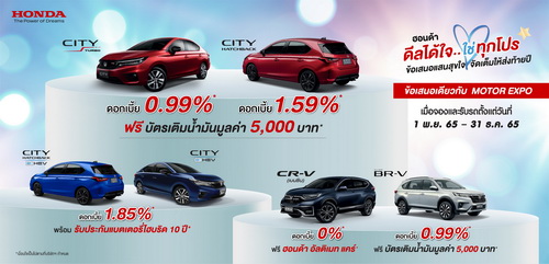 และกลุ่ม D-segment ได้แก่ แอคคอร์ด อี:เอชอีวี และไลน์อัปยนตรกรรมเทอร์โบ ได้แก่ ซิตี้, ซิตี้ แฮทช์แบ็ก, ซีวิค และ แอคคอร์ด และยนตรกรรมเอสยูวี บีอาร์-วี ใหม่ ยนตรกรรมอเนกประสงค์ 7 ที่นั่ง และ ซีอาร์-วี พร้อมด้วยแคมเปญพิเศษส่งท้ายปี “ฮอนด้า ดีลได้ใจ…ใช่ทุกโปร” ให้ลูกค้าเป็นเจ้าของรถยนต์ฮอนด้าได้ง่ายขึ้น โดยเฉพาะกลุ่มซิตี้คาร์ยอดนิยม “ซิตี้ ซีรีส์” ดอกเบี้ยเริ่มต้น 0.99%*