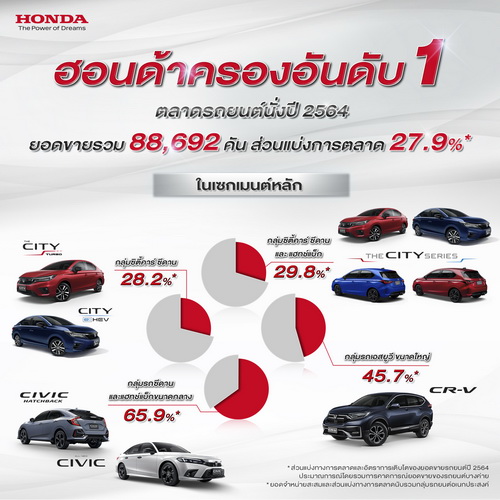 ด้วยยอดจำหน่ายสะสม 88,692 คัน ครองส่วนแบ่งทางการตลาดเป็นอันดับหนึ่งด้วยสัดส่วนถึง 27.9% ซึ่งในปี 2565 คาดว่าการแพร่ระบาดของโควิด-19 และเศรษฐกิจจะมีแนวโน้มในทิศทางที่ดีขึ้น ฮอนด้าก็ขอเป็นกำลังใจให้ทุกคน และหวังว่าจะได้รับการสนับสนุนที่ดีเช่นนี้ต่อไป”