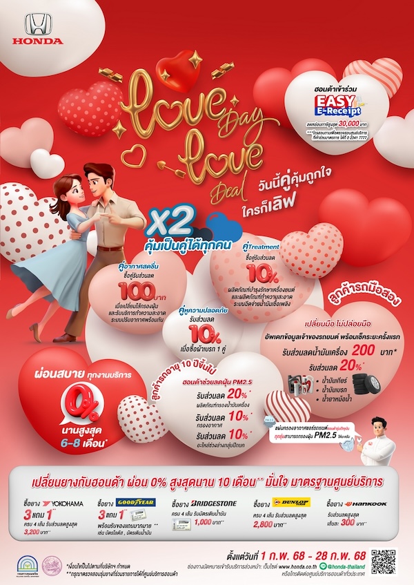 ดูรายละเอียดเพิ่มเติมของแคมเปญฯ ที่ https://www.honda.co.th/promotions/detail/love-day-love-deal-campaign หรือสอบถามรายละเอียดที่โชว์รูมและศูนย์บริการฮอนด้าทั่วประเทศ หรือศูนย์บริการข้อมูลฮอนด้า 24 ชั่วโมง (Honda Call Center) โทร. 0 2341 7777