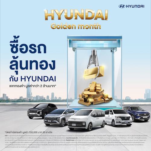 ฮุนได โมบิลิตี้ (ประเทศไทย) ขอบคุณผู้บริโภคชาวไทยด้วยการจัดแคมเปญ Hyundai Golden Month แจกโชคครั้งใหญ่ด้วยของรางวัลมากกว่า 1,700 รางวัล รวมมูลค่ามากกว่า 2 ล้านบาท ให้ลูกค้าที่สนใจในรถยนต์ฮุนได