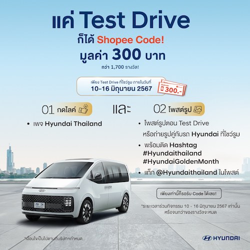 Hyundai Golden Month กิจกรรมสุดพิเศษที่ ฮุนได โมบิลิตี้ ประเทศไทย จัดขึ้นเพื่อตอบแทนลูกค้าชาวไทย เพียงทดลองขับรถยนต์ฮุนไดที่โชว์รูมฮุนไดสาขาใดก็ได้ ระหว่างวันที่ 10 – 16 มิถุนายน 2567 รับรหัสคูปอง Shopee มูลค่า 300 บาท จำนวนจำกัด 1,700 ใบ1