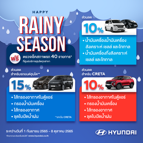 บริษัท ฮุนได มอเตอร์ (ไทยแลนด์) จำกัด จัดแคมเปญ “Happy Rainy Season” เชิญชวนลูกค้านำรถยนต์เข้ารับบริการตรวจเช็คสภาพรถยนต์ฟรี 40 รายการสำหรับรถยนต์ฮุนไดทุกรุ่นพร้อมรับส่วนลดพิเศษสำหรับค่าอะไหล่และน้ำมันเครื่องสูงสุด 15% ตั้งแต่วันที่ 1 กันยายน – 8 ตุลาคม 2565