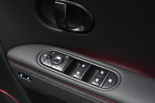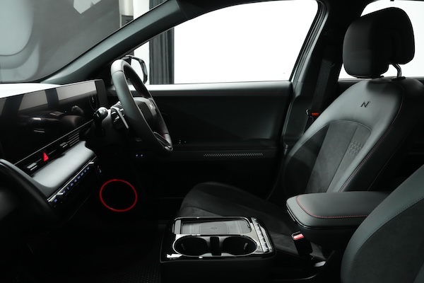 ภายในห้องโดยสารของ IONIQ 5 N Line ผสานความสปอร์ตและความสะดวกสบายระดับพรีเมียมอย่างลงตัว พวงมาลัยหุ้มหนังฉลุลายพร้อมตะเข็บด้ายแดง เบาะนั่งสไตล์สปอร์ตหุ้มด้วยหนัง Alcantara พร้อมโลโก้ N เบาะผู้ขับขี่ปรับเอนนอนได้แบบ Zero Gravity ด้วยไฟฟ้าพร้อมที่พักขา เพิ่มบรรยากาศสปอร์ตด้วยคันเร่งและเบรกดีไซน์สปอร์ต