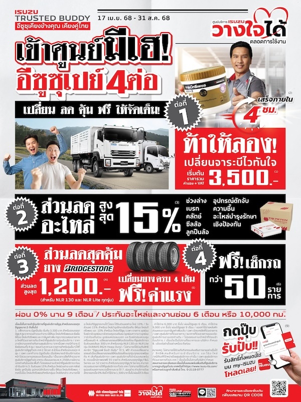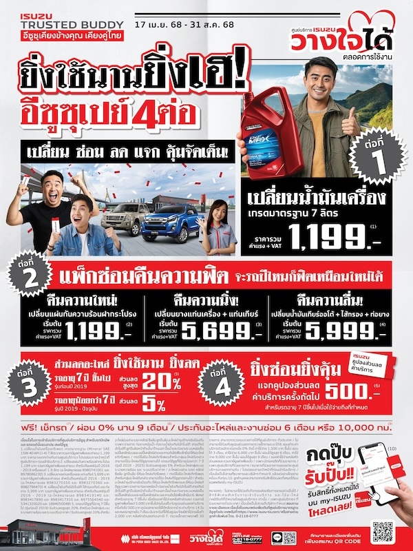 กลับมาเติมความมั่นใจให้รถคู่ใจวันนี้ พร้อมรับความคุ้มที่มากกว่าเดิมจากอีซูซุ ให้รถของคุณได้รับการดูแลอย่างดีจากมืออาชีพที่คุณไว้ใจ ท่านสามารถรับสิทธิพิเศษทั้งหมดนี้ได้ที่แอพพลิเคชัน my-ISUZU (ดาวน์โหลดผ่าน Google play store และ App store) เข้ารับบริการได้ตั้งแต่วันที่ 17 เมษายน 2568 – 31 สิงหาคม 2568
