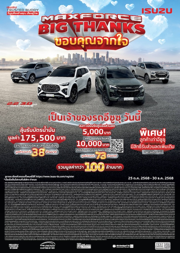 อีซูซุตอกย้ำแนวคิด “ISUZU Trusted Buddy…อีซูซุเคียงข้างคุณ เคียงคู่ไทย” จัดแคมเพจ์นขอบคุณลูกค้าสุดยิ่งใหญ่ส่งท้ายปี “MAXFORCE BIG THANKS ขอบคุณจากใจ” สำหรับลูกค้าที่ซื้อและรับรถปิกอัพอีซูซุ ดีแมคซ์ ทุกรุ่น หรือรถยนต์นั่งอเนกประสงค์มิว-เอ็กซ์ ทุกรุ่น ตั้งแต่วันที่ 25 ตุลาคม – 30 ธันวาคม 2568