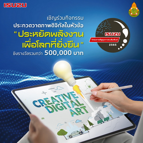 ร่วมส่งผลงานรูปแบบดิจิทัลสุดสร้างสรรค์ในรอบคัดเลือก ภายใต้หัวข้อ “ประหยัดพลังงาน เพื่อโลกที่ยั่งยืน” ผ่านเว็บไซต์ www.isuzuyouthrelations.com วันนี้ – 31 มกราคม 2566 ชิงรางวัลทุนการศึกษาพร้อมโล่ประกาศเกียรติคุณ มูลค่ารวมกว่า 500,000 บาท