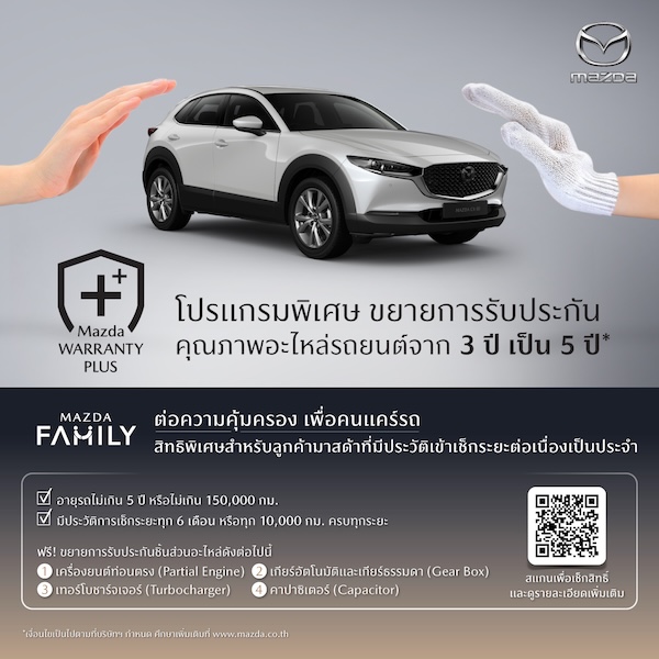 - เปิดตัวโปรแกรมพิเศษ Mazda Warranty Plus ต่อความคุ้มครอง เพื่อคนแคร์รถ เมื่อนำรถเข้าเช็กระยะต่อเนื่องตามกำหนด*
