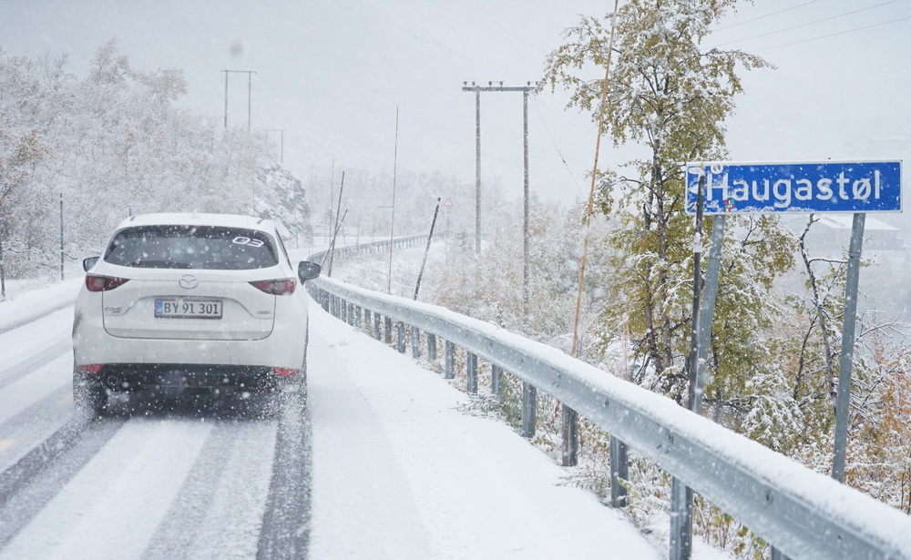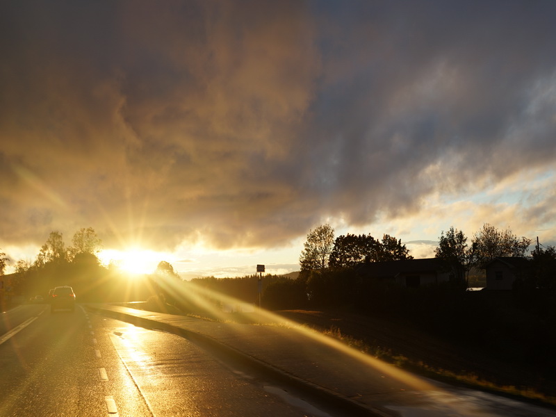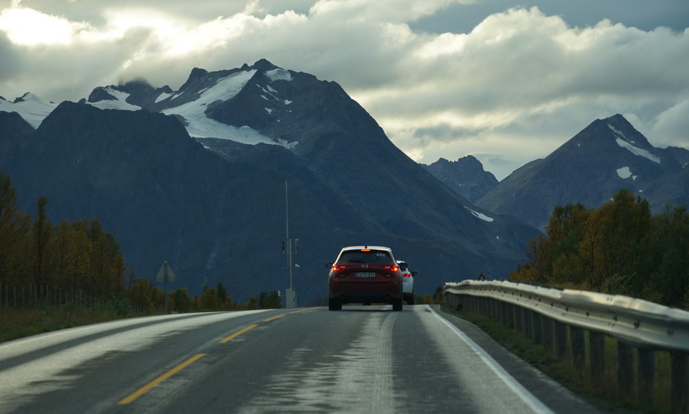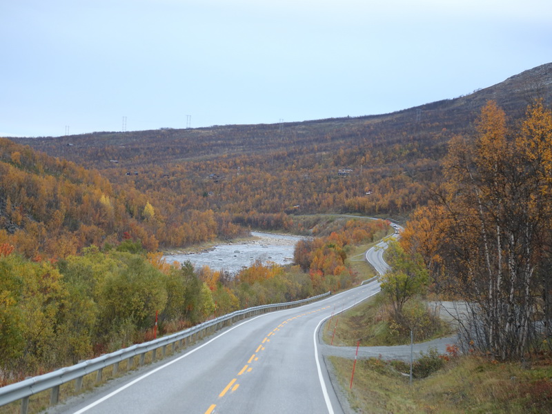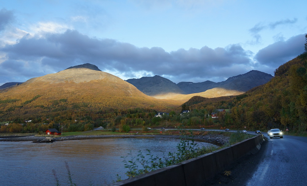 ตลอดสองข้างทางที่เรานั่งรถไป สังเกตว่าถนนที่นี่ค่อนข้างปราบเซียนเพราะเป็นถนนเลนสวนไม่มีเส้นแบ่งกลาง หมายความว่าคุณต้องกะด้วยตัวคุณเอง แถมยังเป็นพวงมาลัยซ้ายขับชิดขวาอีก ซึ่งจะสวนทางกับบ้านเรา ทำให้เวลาขับรถเราต้องเผื่อด้านซ้ายไว้ เพราะถนนที่นี่ไม่มีไหล่ทางอีกด้วย แต่ความพะวงก็หมดไปเมื่อได้มาเห็นบรรยากาศของใบไม้เปลี่ยนสีที่ผสานกับทิวเขาที่ถูกเชื่อมต่อด้วยผืนทะเล ที่เส้นทางลัดเลาะเรียบกับทะเลไปตลอด บรรยากาศค่อนข้างครึมฟ้าครึมฝน เมื่อถึงจุดหมายสักพักก็มีฝนตกลงมาอย่างหนัก เล่นเอาเราเศร้าใจไปเลยเพราะหมายถึงการเห็นแสงเหนือนั้นยากขึ้นไปอีก เพราะเจ้าถิ่นแถวนั้นยังบอกเลยว่าโอกาสเห็น 0 เปอร์เซ็นต์ ด้วยจากสภาพอากาศ ซึ่งนับเป็นความผิดพลาดอย่างมหันต์ของผู้เขียน ซึ่งได้มีการเตรียมอุปกรณ์เพื่อถ่ายแสงเหนือมาจากไทยอย่างเต็มที่ แต่ด้วยคำพูดของคนท้องถิ่นจึงไม่ได้แบกเอาไปที่ North Cape ด้วย
