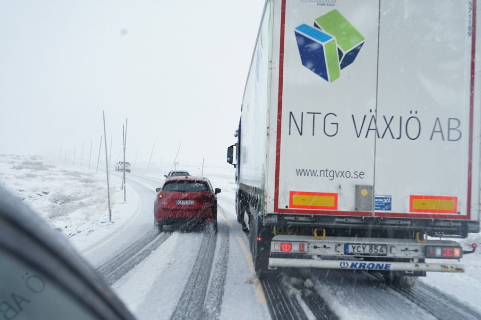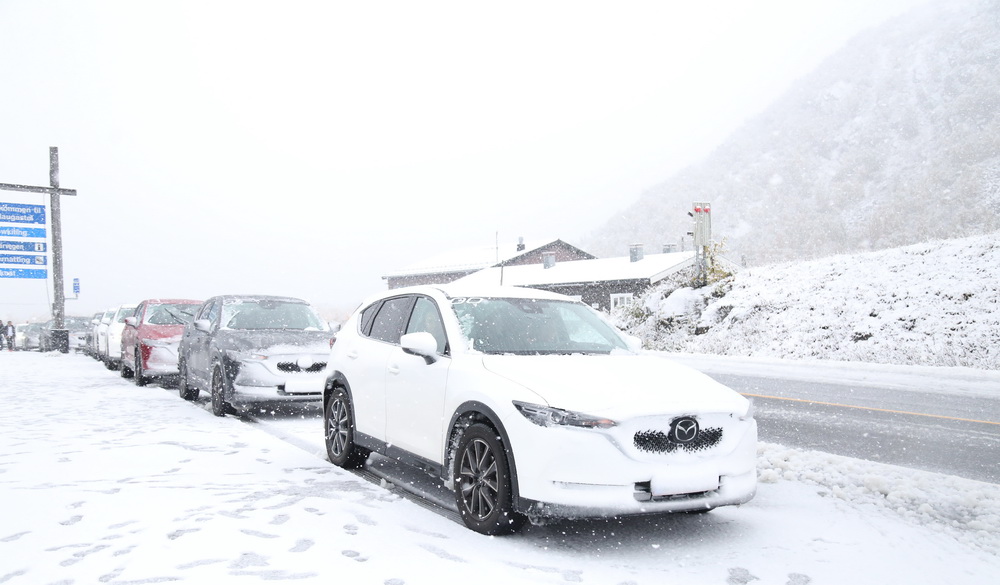 ซึ่งเวลาผ่านไป เมื่อสังเกตเส้นทางข้างหน้าเริ่มมีฝนตกโปรย ๆ แล้วก็เริ่มขุ่นมัว สภาพทัศนวิสัยเริ่มมองไม่เห็นในระยะไกล ถูกแล้วครับเราเจอพายุหิมะแบบฉับพลัน ทำให้การขับขี่กลายเป็นแทบคลานเพราะมีรถในขบวนที่เป็นขับสองล้อด้วย เพราะระหว่างทางก็มีรถตกลงข้างทางให้เห็นตลอด เพราะจริงแล้วรถที่ใช้วิ่งในเส้นทางที่หิมะตกหนาจะต้องเปลี่ยนมาใช้ยางตะปูกันแล้ว แต่นี่หิมะตกแบบไม่ตั้งตัวทำให้พื้นถนนเต็มไปด้วยหิมะซึ่งมีความหนา ซึ่งรถขับสี่ล้อยังมีอาการไถลเลยถ้าออกตัวแรง ๆ ขับเคลื่อนสองล้อคงไม่ไหว เพราะแทบจะใช้ความเร็วไม่ได้เลย จึงต้องให้รถที่เป็นขับเคลื่อนสี่ล้อสองคันมาช่วยขับนำเพื่อเปิดเส้นทางบนถนนให้ แล้วให้รถขับเคลื่อนสองล้อตาม