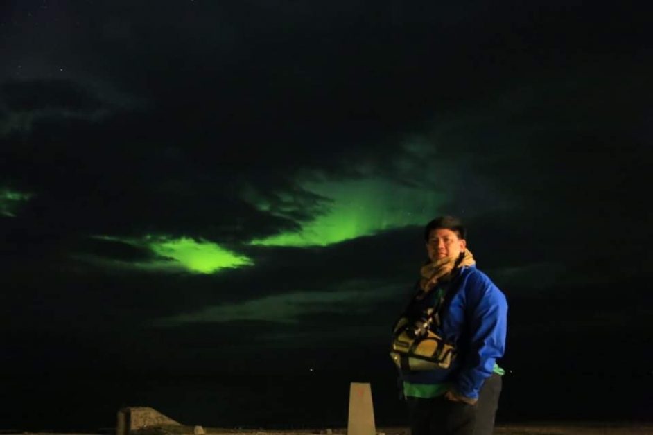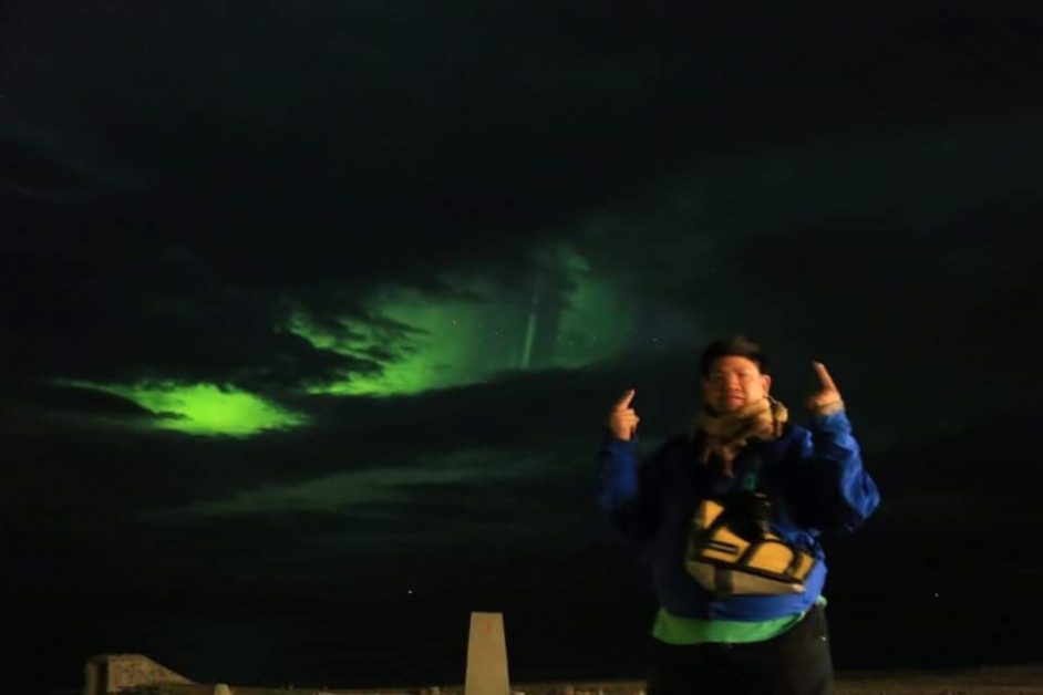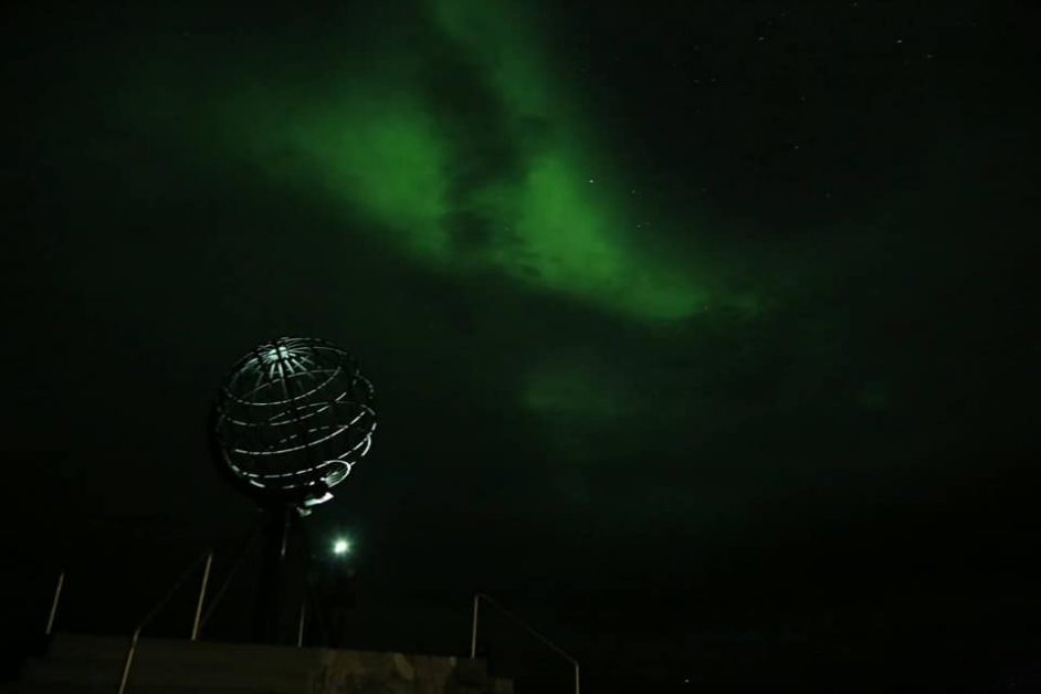 หลังจากถ่ายรูปเก็บบรรยากาศในที่พิพิธภัณฑ์ ก็เริ่มมีเสียงดังจากข้างนอก ด้วยความสงสัยของเพื่อนนักข่าว ที่ลองเอากล้องถ่ายไปบนท้องฟ้าที่มีการเคลื่อนตัวแปลก ๆ ด้วยความสามารถของตัวกล้องทำให้เห็นแสงสีเขียวปรากฎบนภาพ ทุกคนถึงกับตื่นเต้นดีใจ เพราะมันคือแสงเหนือที่ทุกคนตั้งตารอ จากฟ้าที่มืดมิด ท้องฟ้าเริ่มโปร่งทำให้เราเห็นลวดลายม่านสีเขียวด้วยตาเปล่าได้ชัดเจนขึ้น โดยลวดลายจะเปลี่ยนแปลงตลอดเวลา แต่ด้วยความไม่เตรียมพร้อมทำให้เราอดถ่ายภาพสวย ๆ ไปเลย แต่ก็ยังพอเก็บภาพมาได้บ้างแม้อาจจะไม่ชัดมากมายนัก แต่ก็พอเป็นภาพในความทรงจำของพวกเราไปอีกนานแสนนาน นับเป็นโชคดีของพวกเรามาก ๆ เพราะจริง ๆ แล้วแสงเหนือจะเริ่มมาประมาณเดือน 11 แต่นี่มาปรากฏให้เราได้ยลโฉมกันก่อนเป็นเดือน และที่สำคัญที่นี่ในฤดูร้อนช่วงเที่ยงคืน ยังเป็นจุดดูพระอาทิตย์เที่ยงคืนอีกด้วย สำหรับคนที่มานอร์เวย์ไม่ควรพลาด