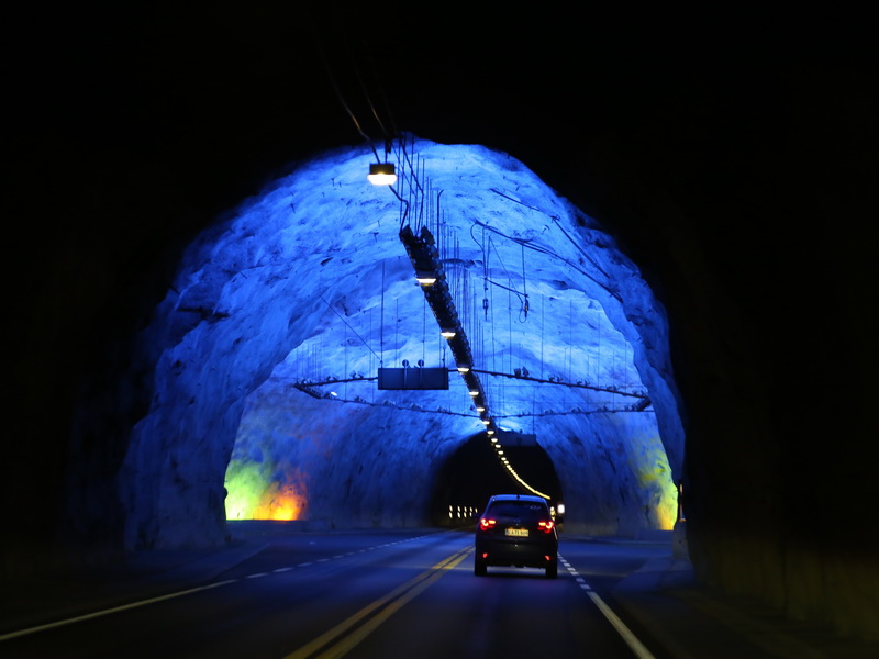 โดยมื้อนี้เป็นอาหารไทยแบบประยุกต์แม้จะไม่จัดจ้านเหมือนบ้านเรา ก็พอให้ลืมรสชาติปลาค็อตที่เป็นอาหารหลักของเราทุกวันมานี้ได้บ้าง ที่เมืองนี้ก็เป็นอีกเมืองท่า โดดเด่นที่มีการเจาะภูเขาทำเป็นที่จอดรถขนาดใหญ่ ที่มีความแปลกตาให้ความรู้สึกเหมือนอยู่ในเหมืองขนาดใหญ่ และมีรูเข้าออกได้หลายทาง และเราก็ขับผ่านเส้นทางเดิม ย้อนกลับไป วันนี้ก็ใช้เวลาค่อนข้างเยอะมาก ไม่ทราบว่าเพราะฝนตกเลยทำให้ใช้ความเร็วไม่ได้ จาก 600 กว่ากิโลเมตรในตอนแรก แต่กลับมาถึงที่พักพอกับเมื่อวานที่ 900 กม. ถึงบอกว่าการเดินทางแบบคาราวานในต่างประเทศมักมีอะไรไม่คาดคิดได้เสมอ เรามาถึงที่พักที่ Leikanger ซึ่งในคืนนั้นเหมือนพายุเข้าฝนตกอย่างหนักแถมลมพัดแรง ทำเอานอนไม่ค่อยหลับกันทีเดียว