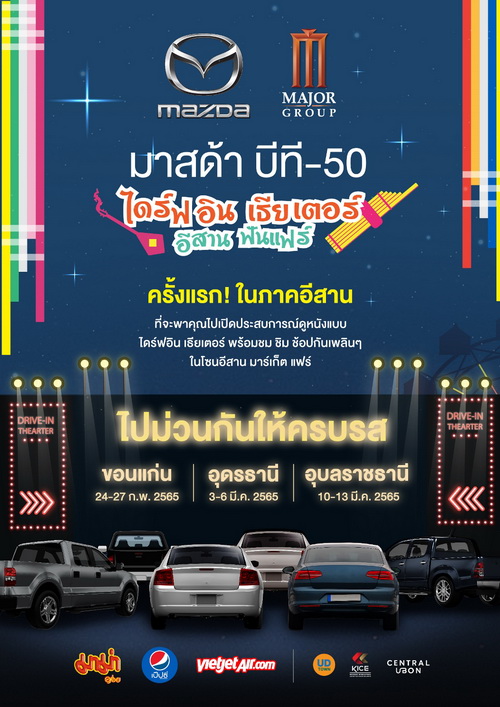 สำหรับงานมาสด้า บีที-50 ไดร์ฟอิน เธียเตอร์ อีสาน ฟันแฟร์ เป็นความร่วมมือระหว่าง มาสด้า และ เมเจอร์ พร้อมด้วยพันธมิตรชั้นนำอย่าง บะหมี่กึ่งสำเร็จรูป ตรามาม่า, เครื่องดื่มเป๊ปซี่ และสายการบินไทยเวียตเจ็ท ร่วมกันสร้างสรรค์ประสบการณ์สุดพิเศษไปกับการชมภาพยนตร์ในรูปแบบโรงภาพยนตร์ไดร์ฟ-อิน รับชมในรถยนต์ส่วนตัว ผ่านจอ LED ขนาดยักษ์ ที่ให้ความคมชัดระดับ 4K