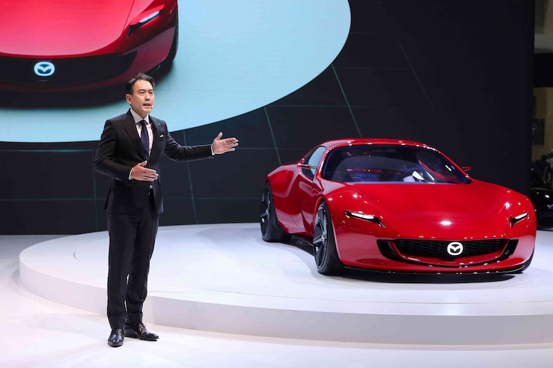 เริ่มจาก ยานยนต์ต้นแบบสปอร์ตคอมแพ็คคาร์ Mazda Iconic SP ที่ขับเคลื่อนด้วยพลังงานไฟฟ้าโดยใช้เครื่องยนต์โรตารี่แบบ 2 โรเตอร์ ทำหน้าที่ผลิตกระแสไฟฟ้าเข้าสู่แบตเตอรี่ รองรับการใช้พลังงานหลากหลายรูปแบบ มีจุดศูนย์ถ่วงต่ำ น้ำหนักเบา กระจายน้ำหนัก 50:50