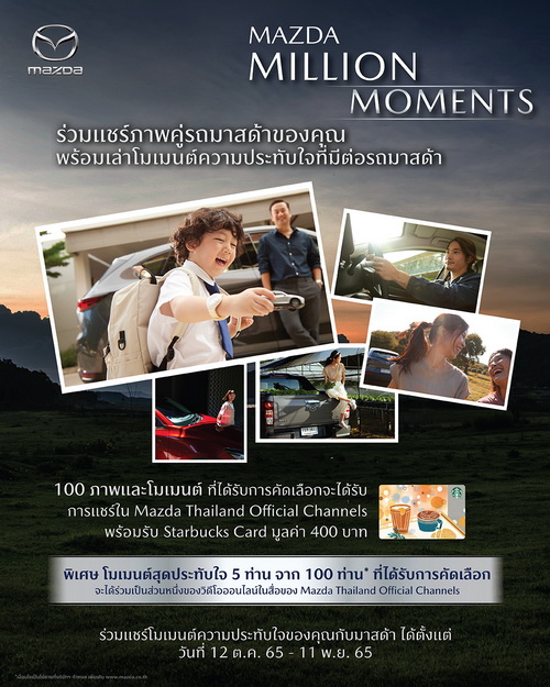 กับกิจกรรม Mazda Million Moments โดย 100 ภาพและเรื่องราวที่ได้รับการคัดเลือกจะได้รับการแชร์ในสื่อของ Mazda Thailand Official พร้อมรับ Starbucks Card มูลค่า 400 บาท และมีสิทธ์ร่วมเป็น 1 ใน 5 เรื่องราว ของวิดีโอออนไลน์ ที่บันทึกโมเมนต์ความประทับใจกับมาสด้าบน Mazda Thailand Official Channels
