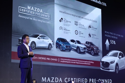 เป็น 30% ในปีงบประมาณ 2565 หรือเพิ่มขึ้น 100% ซึ่งเป็นไปตามแผนที่มาสด้าวางไว้ นอกจากนั้น การแผนการพัฒนาธุรกิจรถมือสองคุณภาพดี Mazda CPO ก็ดำเนินไปได้ด้วยดี ส่งผลให้ราคารถยนต์มือสอง (Residual Value) มีราคาขายต่อสูงขึ้น เช่น มาสด้า2 อายุ 6 ปี มีมูลค่าการขายต่อเพิ่มขึ้นเป็น 55%