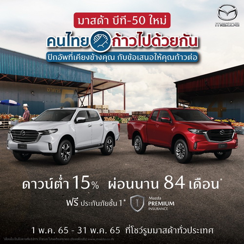 ซึ่งเป็นแคมเปญเพื่อส่งเสริมให้คนไทยมีกำลังใจลุกขึ้นสู้และก้าวต่อไปด้วยกัน เพื่อเติมเต็มความสุขของครอบครัว พร้อมที่จะเดินหน้าสร้างธุรกิจและก้าวไปสู่ความสำเร็จที่ตั้งเป้าหมายไว้ ด้วยข้อเสนอ เงินดาวน์ต่ำเพียง 15% ผ่อนนานสูงสุด 84 เดือน1 ฟรีประกันภัยชั้น 11 Mazda Premium Insurance อีกด้วย ซึ่งนับเป็นแคมเปญที่ดีที่สุดที่ลูกค้าไม่ควรพลาด”