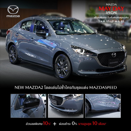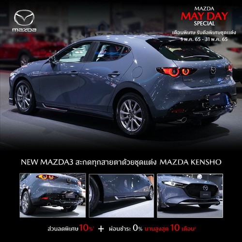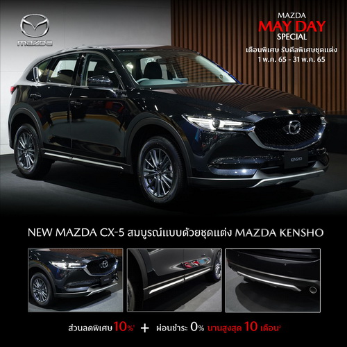 กับดีลพิเศษชุดแต่งแท้จาก MAZDASPEED และ MAZDA KENSHO สำหรับรถยนต์มาสด้า2, มาสด้า3 และมาสด้า CX-5 โดยมอบส่วนลดพิเศษ 10%3 ผ่อน 0% นานสูงสุด 10 เดือน4 ระหว่างวันที่ 1 พ.ค. 65 – 31 พ.ค. 65 ที่โชว์รูมมาสด้า