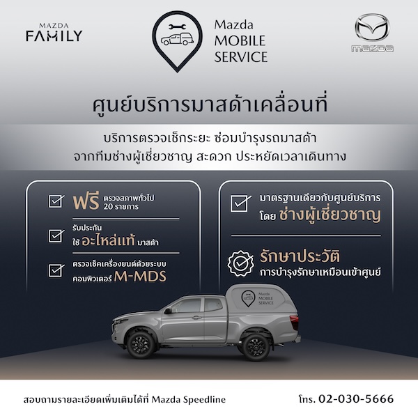 “MAZDA MOBILE SERVICE” หรือศูนย์บริการมาสด้าเคลื่อนที่ เพื่อเพิ่มความสะดวกให้กับลูกค้าในการเข้ารับบริการเช็กตามระยะและซ่อมบำรุงรักษา