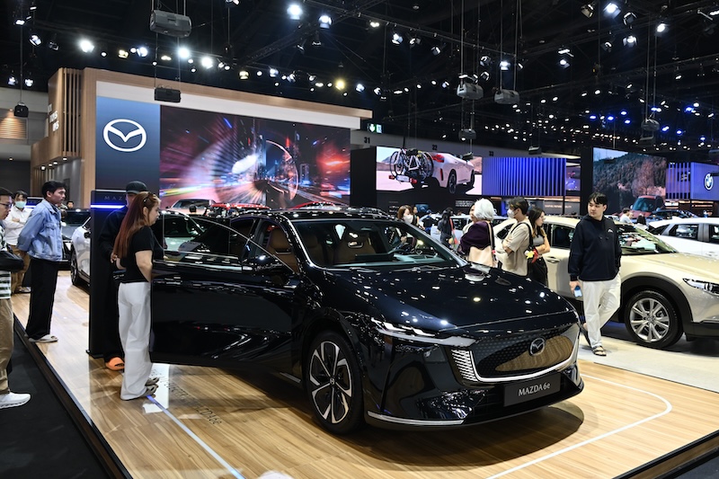 ผู้เข้าชมสัมผัส Mazda6e สีดำภายในบูธ Mazda ในงาน Motor Expo 2025