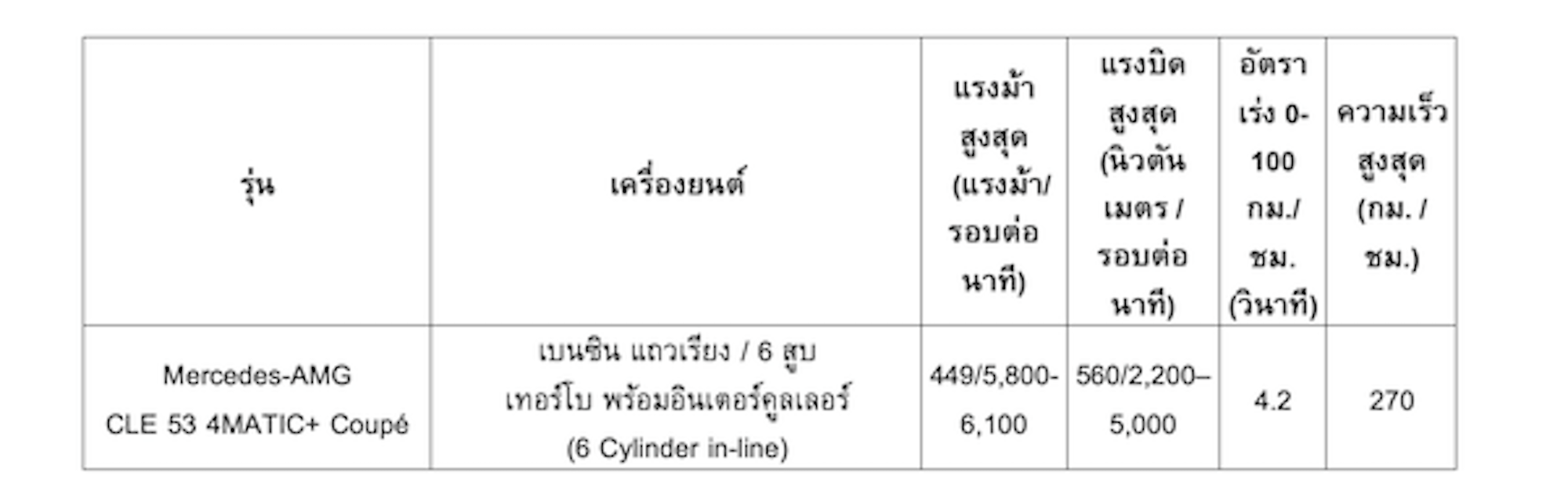Mercedes-AMG CLE 53 4MATIC+ Coupé รถสปอร์ตคูเป้สมรรถนะสูง มาพร้อมการติดตั้งอุปกรณ์ขั้นสูงจาก Mercedes-AMG ที่มีมากที่สุดในบรรดารถรุ่นประกอบในประเทศ ไม่ว่าจะเป็น AMG Performance 4MATIC+, AMG DYNAMIC PLUS Package, Active engine mount และ AMG Real Performance Sound โดยใช้เครื่องยนต์ชุดเดียวกับ CLS 53 และ GLE 53