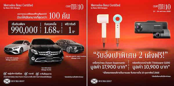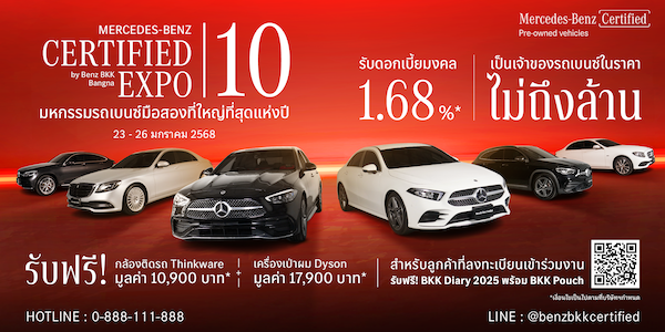 พบกับงาน Mercedes-Benz Certified by Benz BKK Bangna EXPO ครั้งที่ 10 พร้อมข้อเสนอสุดพิเศษ และรถยนต์เมอร์เซเดส-เบนซ์คุณภาพเยี่ยมกว่า 100 คัน คัดสรรมาเพื่อคุณโดยเฉพาะ!