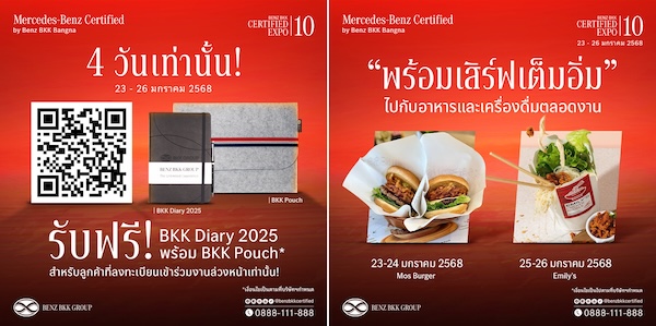 พบกับมหกรรมรถเมอร์เซเดส-เบนซ์มือสองที่คุ้มค่าที่สุดในปีนี้! พร้อมอาหารและเครื่องดื่มเสิร์ฟ ฟรีตลอดงาน* ลงทะเบียนร่วมงานวันนี้ รับฟรี! BKK Diary และกระเป๋า iPad ดีไซน์สุดคูล พบกันที่งาน Mercedes-Benz Certified by Benz BKK Group EXPO ครั้งที่10 วันที่ 23 – 26 มกราคม 2568 โอกาสดีแบบนี้มีเพียง 4 วันเท่านั้น! ที่ชั้น 3 โชว์รูม Benz BKK Bangna