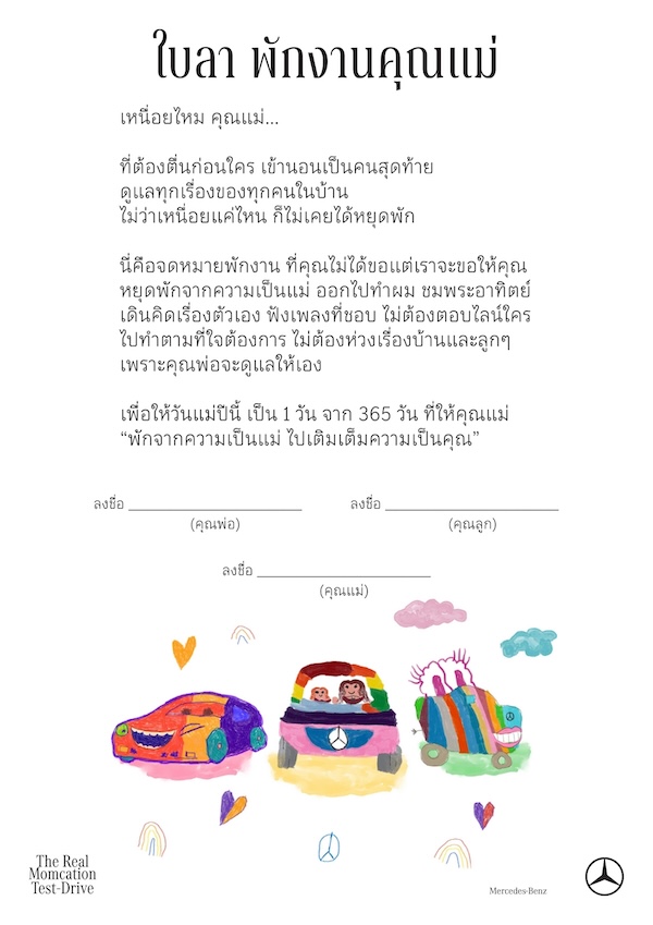 และสำหรับคุณพ่อที่กำลังมองหาวิธีน่ารัก ๆ เพื่อชวนคุณแม่ไป Momcation Test Drive สามารถดาวน์โหลด “ใบลา พักงานคุณแม่” จากเมอร์เซเดส-เบนซ์ ผ่านลิงก์ https://mb4.me/Momcation_25 เพื่อไปชวนคุณแม่และคุณลูกที่บ้านเซ็น หรือโพสต์ลงบนโซเชียลมีเดีย พร้อมติดแฮชแท็ก #MomcationTestDrive #MercedesBenzThailand