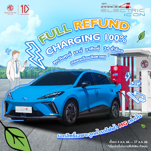 เอ็มจี ต่อแคมเปญ “เติมพลังงานสะอาดให้คุณ ชาร์จเท่าไหร่ เอ็มจี คืนให้เท่านั้น” ทุกวีคเอนด์ตลอดเดือนสิงหาคมนี้