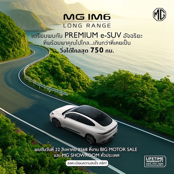 - NEW MG IM6 LONG RANGE เปิดให้ลงทะเบียนความสนใจล่วงหน้าได้ตั้งแต่วันนี้จนถึงวันที่ 22 สิงหาคม 2568 ผ่านช่องทาง https://www.mgcars.com/th/promotions/MG-IM6-Long-Range-Teaser