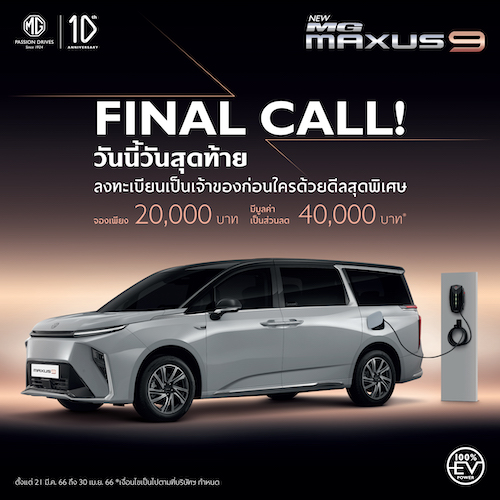 บริษัท เอสเอไอซี มอเตอร์ – ซีพี จำกัด และ บริษัท เอ็มจี เซลส์ (ประเทศไทย) จำกัด ผู้ผลิตและผู้จำหน่ายรถยนต์เอ็มจีในประเทศไทย ประกาศเข้าสู่ช่วงโค้งสุดท้ายของการเป็นเจ้าของ NEW MG MAXUS 9 รถลักชัวรี่ e-MPV แบบ 7 ที่นั่ง ที่ขับเคลื่อนด้วยพลังงานไฟฟ้า 100% ก่อนใคร พร้อมรับข้อเสนอพิเศษ จองเพียง 20,000 บาท จะมีมูลค่าเป็นส่วนลด 40,000 บาท