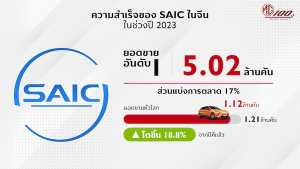 บริษัท เอสเอไอซี มอเตอร์ – ซีพี จำกัด และ บริษัท เอ็มจี เซลส์ (ประเทศไทย) จำกัด ผู้ผลิตและผู้จำหน่ายรถยนต์เอ็มจีในประเทศไทย ฉลองการเป็นแบรนด์รถยนต์ที่เติบโตมาอย่างยาวนานครบ 100 ปี พร้อมเผยความสำเร็จของ SAIC Motor Corporation หลังครองแชมป์ยอดขายสูงสุดในปี 2566 ที่ประเทศจีนรวมกว่า 5.02 ล้านคัน