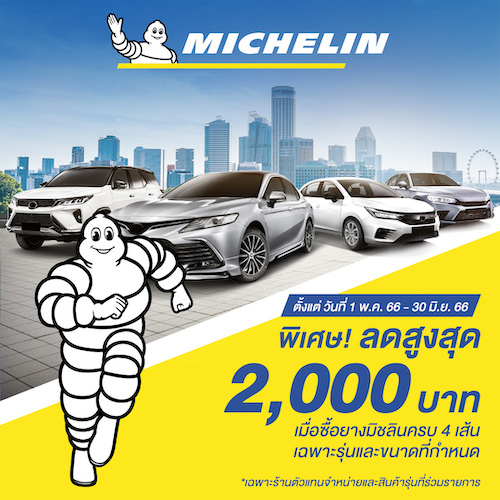 - ส่วนลดมูลค่า 1,000 บาท เมื่อซื้อยางสำหรับรถเล็กและอีโคคาร์จำนวน 4 เส้น รุ่น MICHELIN Energy XM2+ ขนาด 185/55 R16